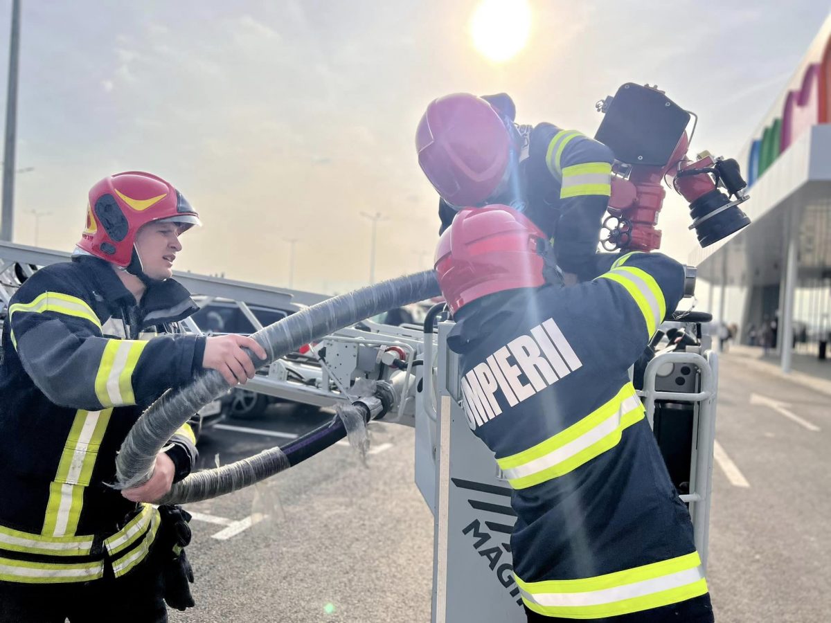 Pompierii militari ai Detașamentului Sibiu au desfășurat astăzi un exercițiu cu forțe și mijloace în teren la un centru comercial din zona de nord a municipiului Sibiu.