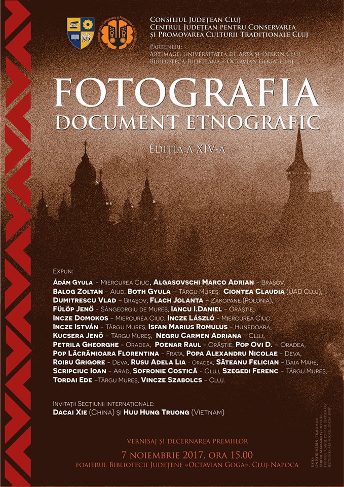 Centrul Judeţean pentru Conservarea şi Promovarea Culturii Tradiţionale Cluj (C.J.C.P.C.T. Cluj), instituţie de cultură aflată sub autoritatea Consiliului Judeţean Cluj, invită iubitorii fotografiei etnografice marți, 7 noiembrie 2017, începând cu ora 15.00, la vernisajul Concursului naţional „FOTOGRAFIA – DOCUMENT ETNOGRAFIC”, ediţia a XIV-a.