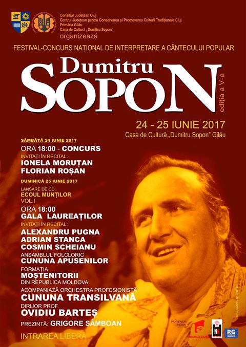 Centrul Judeţean pentru Conservarea şi Promovarea Culturii Tradiţionale Cluj, instituție de cultură care funcționează în subordinea Consiliului Județean Cluj, organizează, în parteneriat cu Primăria Gilău şi Casa de Cultură „Dumitru Sopon” din Gilău, cea de-a V-a ediţie a Festivalului-concurs naţional de interpretare a cântecului popular „Dumitru Sopon”. Știriul va avea loc sâmbătă şi duminică, 24 și 25 iunie 2017, la Casa de Cultură din localitatea clujeană Gilău.