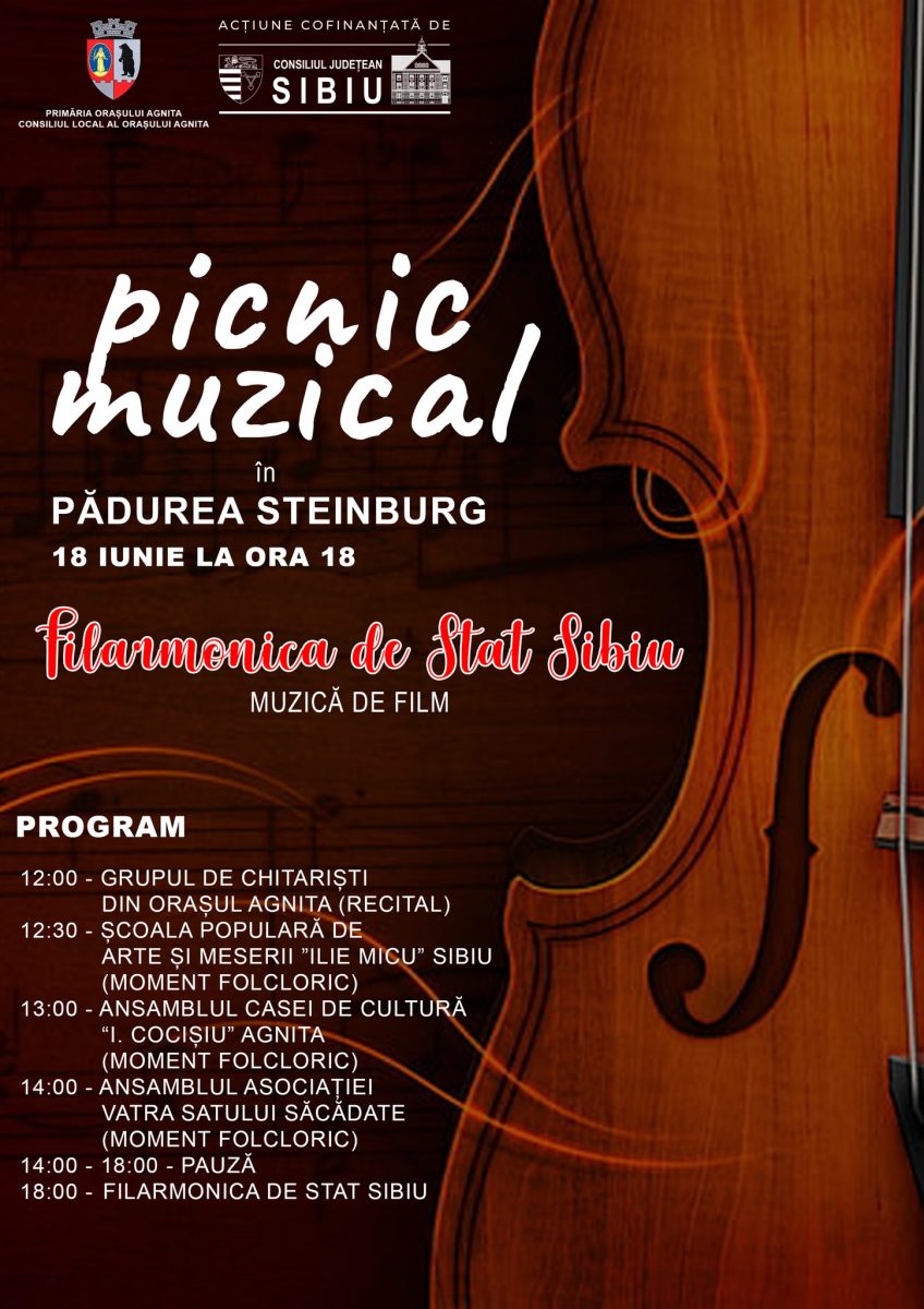 Melodii celebre din filme la fel de cunoscute vor răsuna în pădurea Steinburg din Agnita spre încântarea localnicilor și a turiștilor care vor veni la picnicul muzical organizat de Primaria Orasului Agnita și Casa de Cultură ”Ilarion Cocișiu”, cu sprijinul financiar oferit de Consiliul Judetean Sibiu.