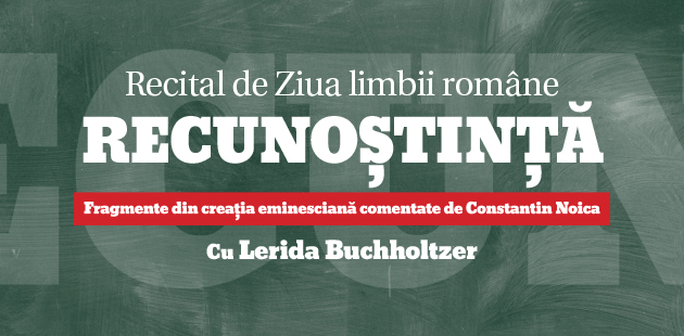 Sub genericul „Recunoştinţă”, actriţa Lerida Buchholtzer va interpreta fragmente din creaţia eminesciană comentate de Constantin Noica, filosoful care îl consideră pe Eminescu omul deplin al culturii româneşti: „Darul ce ni s-a făcut prin Eminescu? A apărut în lumea noastră un om care-a înţeles să fie om deplin. Cineva care n-a vroit să fie al doilea.”